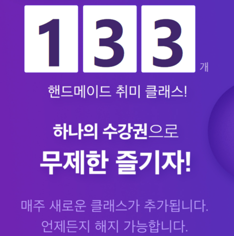 특히나 준비물을 함께 제공한다거나 작가님과 직접 소통하며 수업에 참여할 수 있다는 점이 메리트로 작용하는 것 같습니다. 심사를 거쳐서 작가님이 되셨기 때문에 수업의 퀄리티 또한 보장할 수 있습니다. 이제는 구독과 비슷한 개념인 무제한 수강권이 오픈되었습니다.